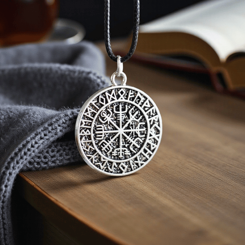 Die Halskette trägt das Symbol des Vegvísir, auch bekannt als „Wikinger-Kompass“. Es steht für Orientierung, Schutz und den sicheren Weg durch wechselhafte Zeiten. Der Anhänger in Metalllegierung hängt an einem schwarzen Band – minimalistisch und authentisch nordisch.