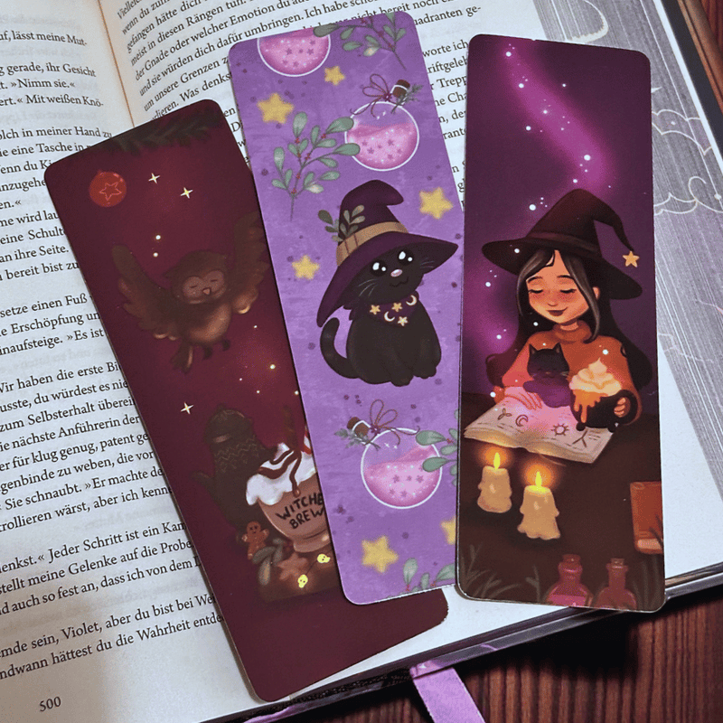 Magische Lesemomente verdienen ein ebenso magisches Lesezeichen. Von der Künstlerin MoonElly entstanden diese detailreichen Designs, die Winterstimmung, Witchy-Vibes und liebevolle Illustrationen vereinen.