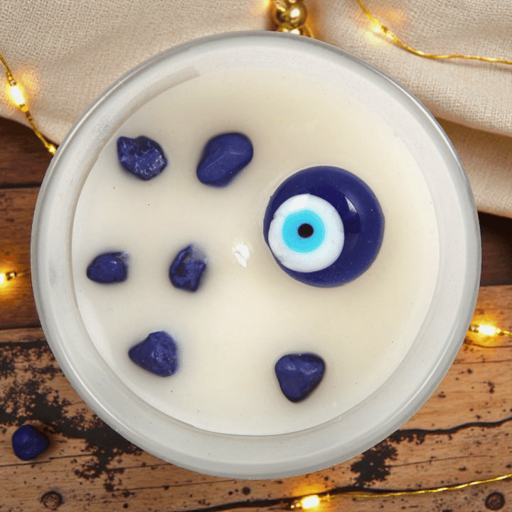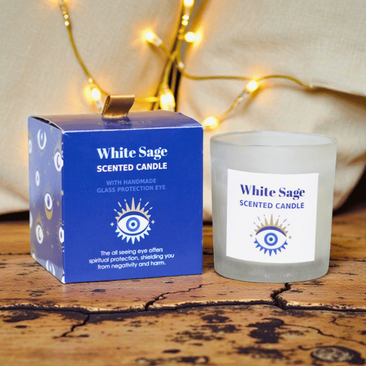 Duftkerze Weißer Salbei – Allsehendes Auge mit Sodalith Kristallsplittern