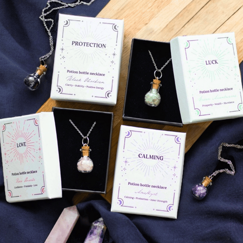 Vier zauberhafte Kristalle, vier magische Bedeutungen – die Kristall in Zaubertrank-Fläschchen Halskette ist ein einzigartiges Schmuckstück, das Magie, Eleganz und Symbolik vereint. Jedes Fläschchen enthält echte Kristallsplitter und trägt eine besondere Botschaft, die dich durch deinen Alltag begleitet.