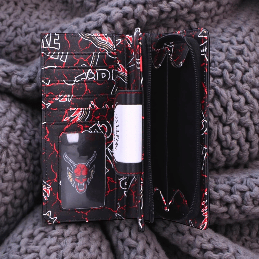 Die kunstvollen Details erinnern an die dunkle Macht von Vecna und die Monster aus dem Upside Down, die in der letzten Staffel Schrecken und Faszination zugleich auslösten. Innen überzeugt das Portemonnaie mit durchdachter Aufteilung: mehrere Kartenfächer, ein separates Münzfach mit Reißverschluss und genügend Platz für Geldscheine und kleine Notizen – perfekt für dein nächstes Abenteuer.
