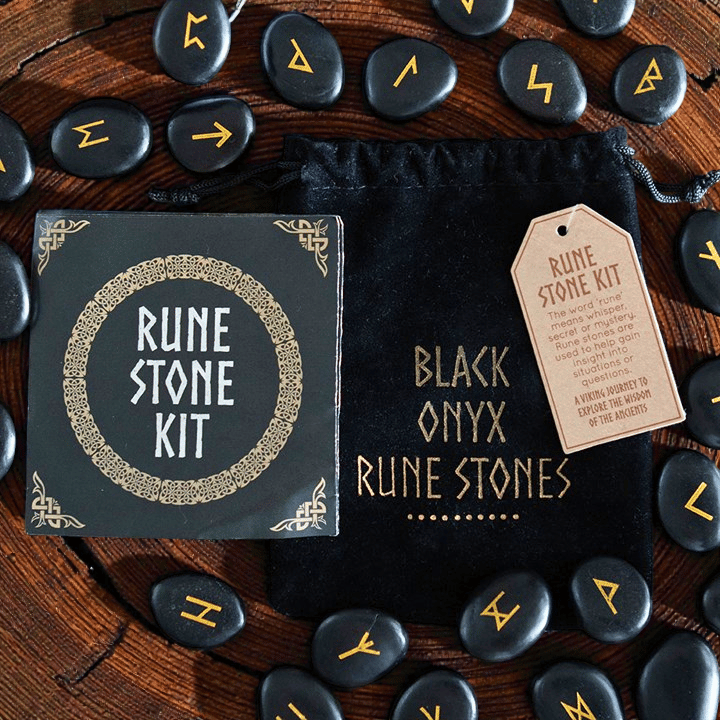 Runensteine Set aus schwarzem Onyx – 25 Viking Runen für Orakel und Deko