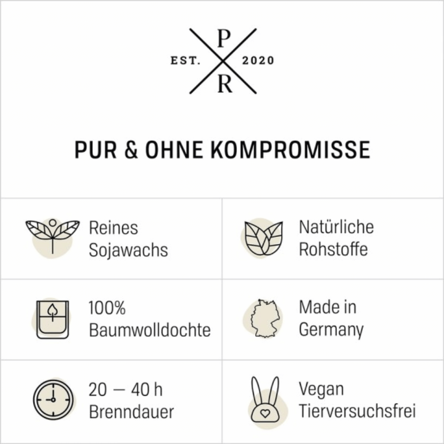 Die Kerze wird aus 100 % natürlichem Sojawachs handgegossen und steht für höchste Qualität und Reinheit. Der Docht aus Baumwolle sorgt für ein sauberes, gleichmäßiges Abbrennen, während der hohe Anteil ätherischer Öle das Dufterlebnis intensiv und authentisch macht. Das klare Glasdesign mit dezentem Etikett fügt sich stilvoll in jedes Zuhause ein – ein zeitloses Statement für Natürlichkeit und Achtsamkeit.
