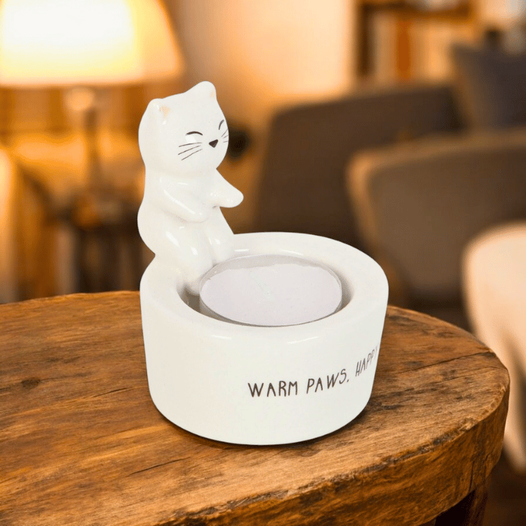 Dieser Katzen-Teelichthalter aus Keramik ist pure Wärme fürs Herz. Mit seinem liebevollen Design, den kleinen Pfoten und dem zufriedenen Ausdruck bringt er sofort eine cozy, geborgene Stimmung in dein Zuhause.
