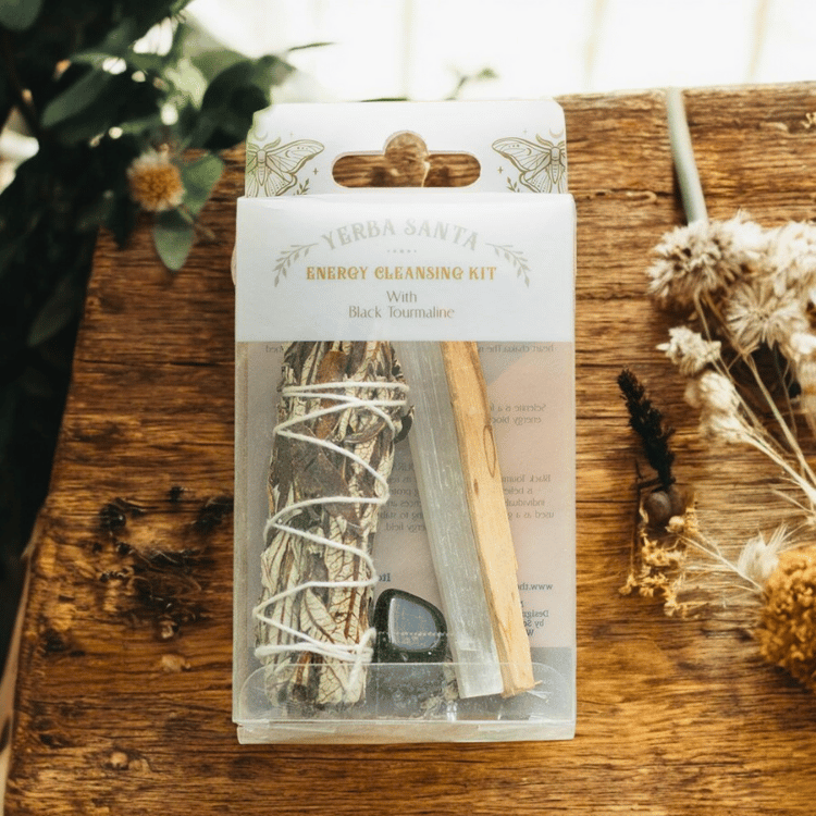 Dieses Reinigungs-Smudge-Set mit Yerba Santa und Palo Santo kombiniert mehrere traditionelle Bestandteile zu einem sorgfältig zusammengestellten Set. Es enthält ein Bündel Yerba Santa Salbei, Palo Santo Holz, einen Selenit-Kristall und einen schwarzen Turmalin-Kristall – alles verpackt in einer kompakten Box.