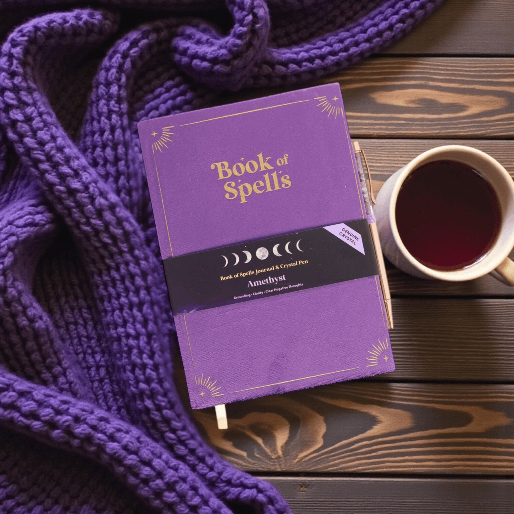 Dieses Journal fühlt sich an wie ein persönliches Zauberbuch für deinen Alltag. Violettes Cover, goldene Details, ein Band als stiller Marker zwischen den Seiten, weicher angenehmer Einband – bereit für Notizen, Rituale, Listen und Gedanken, die nicht verloren gehen sollen.