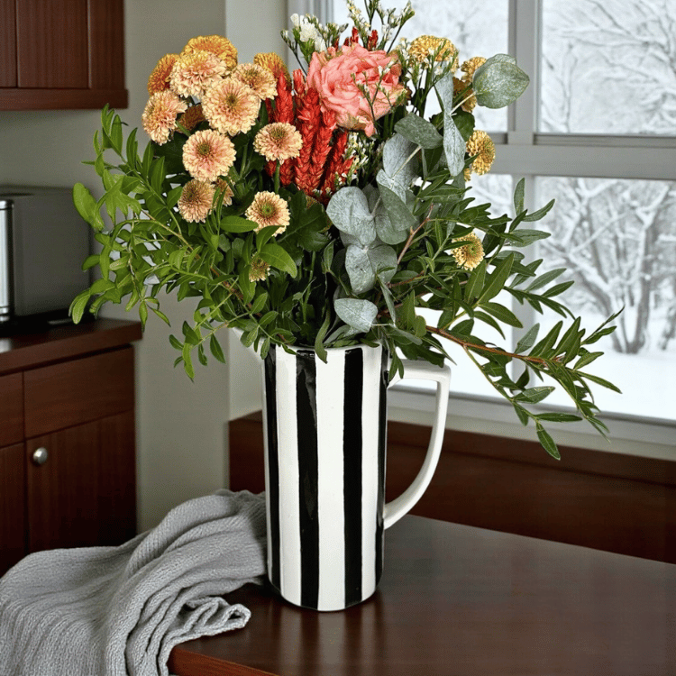 Diese Vase ist kein bloßes Gefäß – sie ist ein Kunstobjekt. Mit ihrem markanten Schwarz-Weiß-Streifenmuster zieht sie alle Blicke auf sich und bringt modernen Stil mit einem Hauch Retro-Charme in jedes Zuhause. Die geschwungene Krugform wirkt gleichzeitig elegant und verspielt – perfekt, um schlichte Räume aufzuwerten oder bereits bestehende Dekorationen harmonisch zu ergänzen.