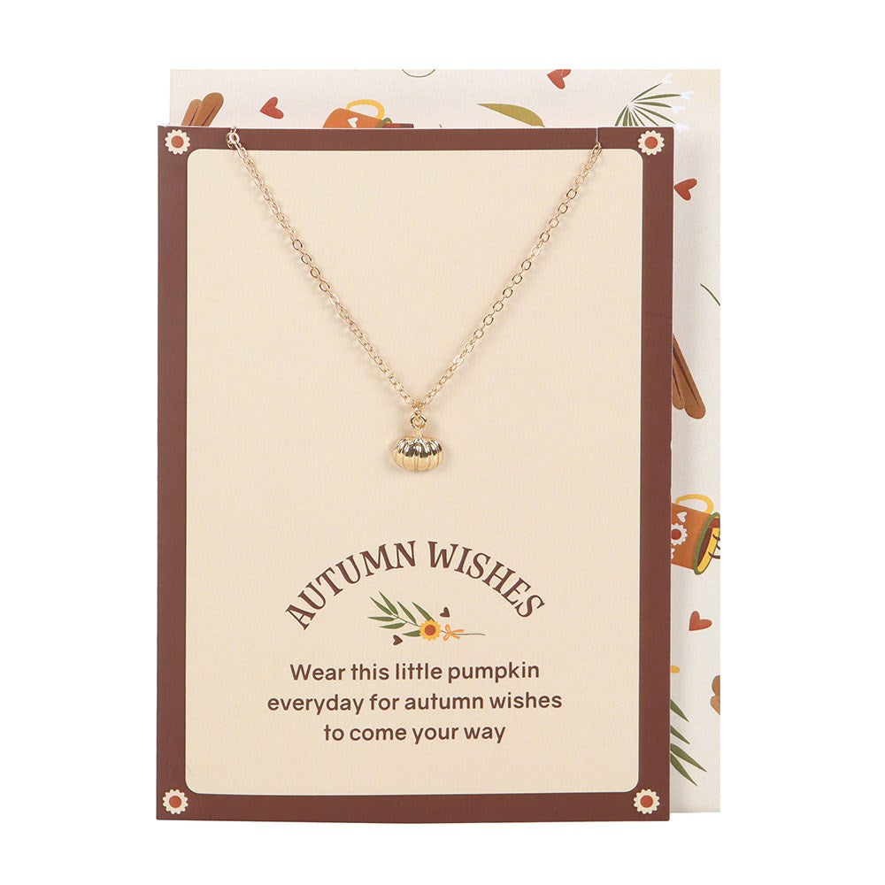 Dieses kleine Schmuckstück ist ein herbstlicher Glücksbringer zum Verschenken oder Selbstbehalten: eine filigrane Kürbis Halskette, präsentiert auf einer liebevoll gestalteten Karte mit der Aufschrift:
