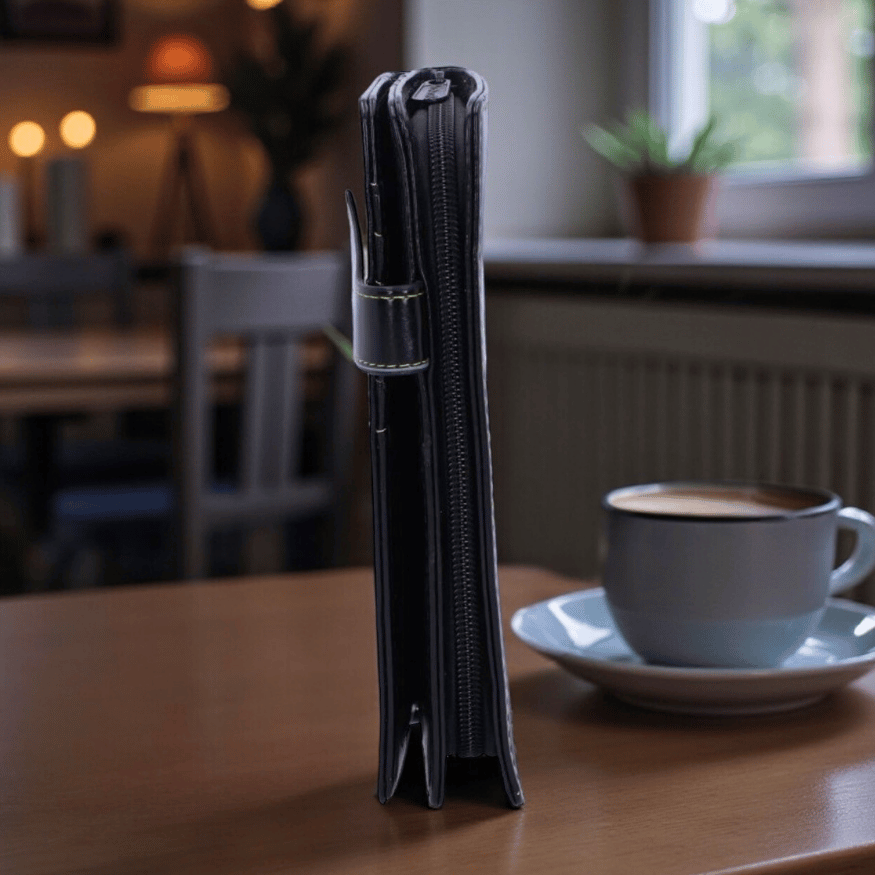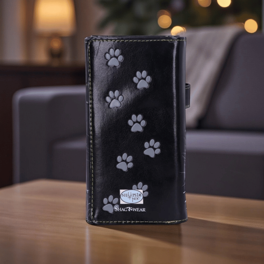 Diese elegante schwarze Geldbörse mit geprägtem Katzenmotiv ist ein stilvolles Must-have für alle, die Katzen und Mystik lieben. Das dezente Design zeigt eine geheimnisvolle Katzenfigur mit leuchtend grünen Augen, deren Schweif sich spielerisch über die Rückseite zieht – ein Symbol für Intuition und kleine Alltagszauber.