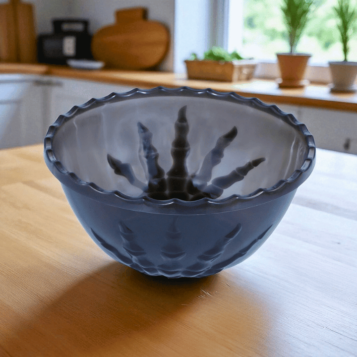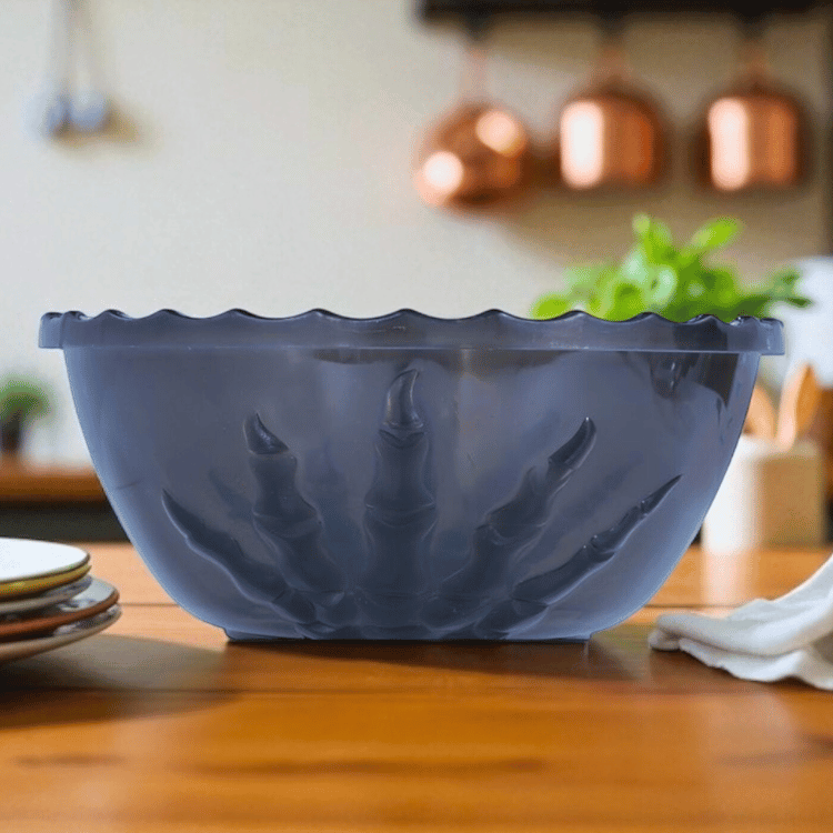 Mit ihrer prägten Knochenhand außen am Rand wirkt sie wie direkt aus einem Hexenkessel-Laden – düster, dekorativ und auffällig. Sie ist groß genug für deine Gruseldinner, Mottopartys, Filmabende oder auch als stylishe Deko-Schale mit Kunstspinnen, Eiswürfeln oder Marshmallows.