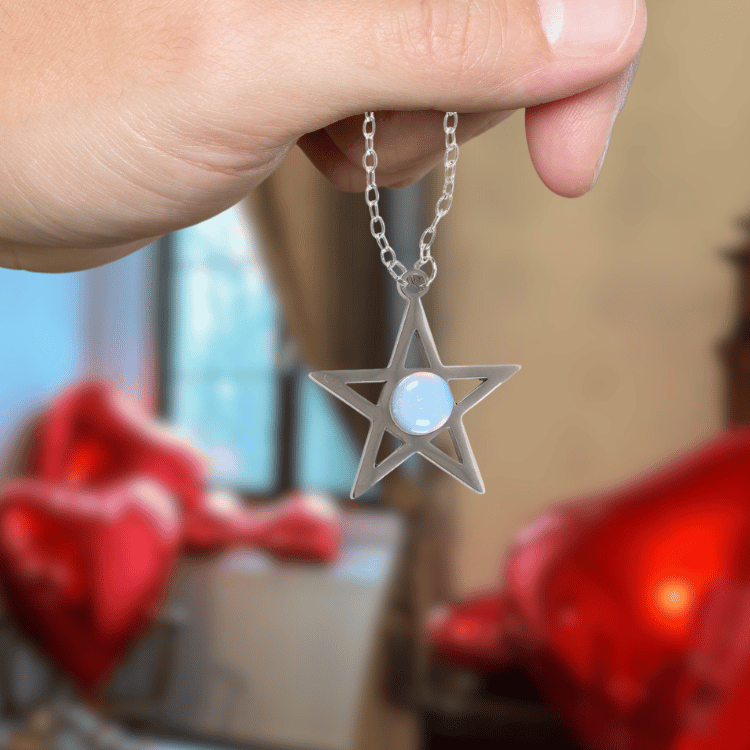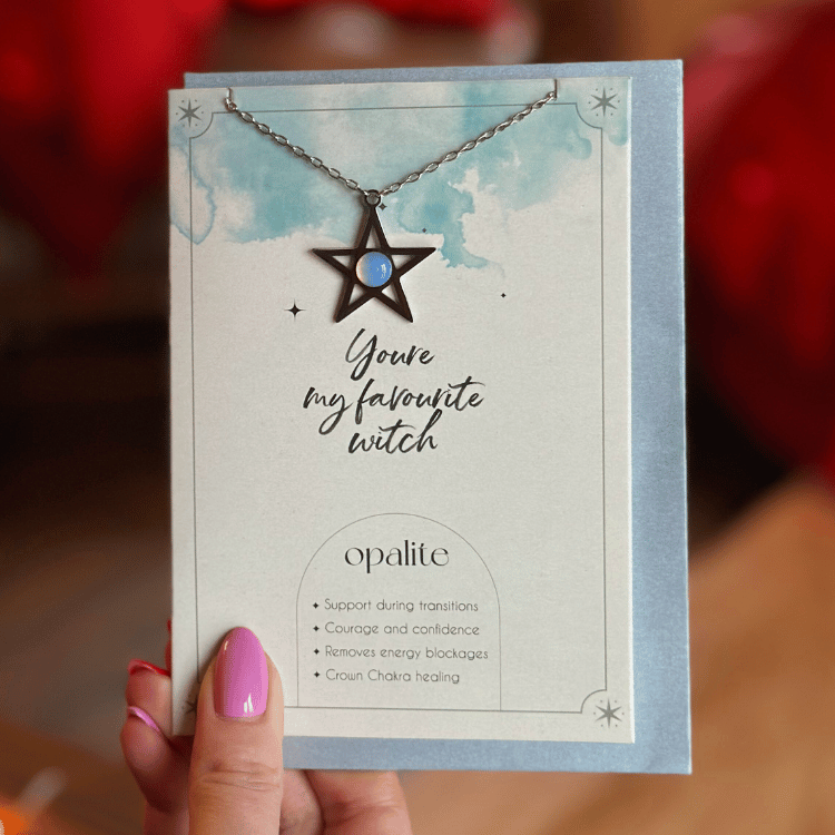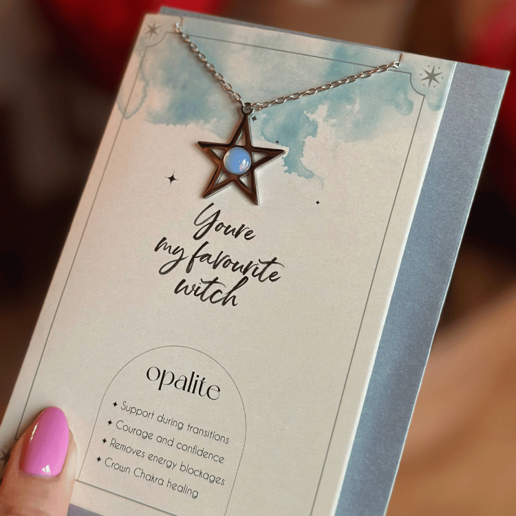 Eine zauberhafte Karte mit dem Spruch "You're my favourite witch" welche eine silberfarbene Pentagramm-Halskette beinhaltet, die von einem Opalit-Stein akzentuiert wird. Der Opalit ist ein künstlich hergestellter Stein, der an Opal und Mondstein erinnert, aber nicht weniger magische Kräfte besitzt. Er wird verwendet, um Mut zu fördern und Energieblockaden zu beseitigen. Ob für sich selbst oder an einen geliebten Menschen, damit trägt man immer ein Stück Magie mit sich.